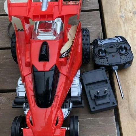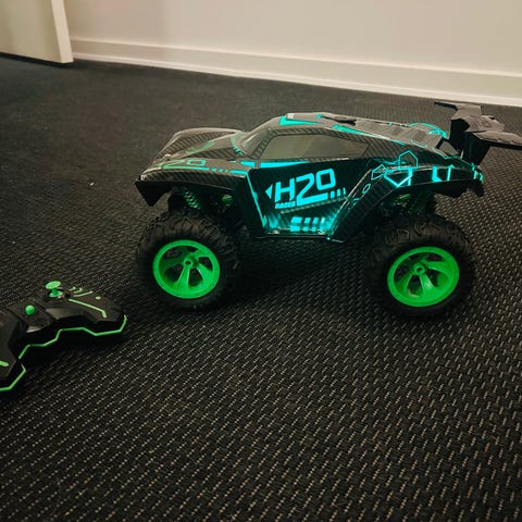 H2O fjernstyret bil i sort og rød med store terrændæk. Bilen leveres med matchende fjernbetjening og er egnet som legetøj til børn, der ønsker en radiostyret bil til kørsel indendørs eller udendørs.
