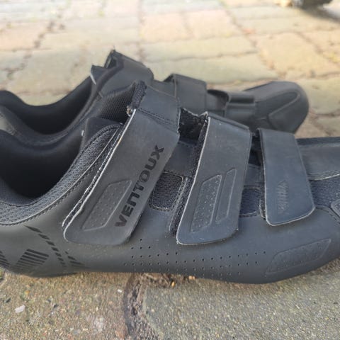 Ventoux cykelsko spinningsko i størrelse 47. Skoene er sorte og har tre velcrolukninger på overdelen. Overdelen har meshfelter for ventilation. Sålen er stiv og udstyret med Look Delta klamper (3-bolts montering, som på billedet). Velegnet til landevejscykling eller spinning.
