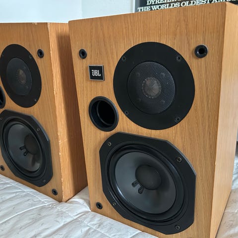 JBL L20 reolhøjttalere i sort træfinish med frontstof. Produceret i Danmark. Jeg er eneste ejer. Har aldrig spillet ultrahøjt. Sælges da jeg er gået over til aktive højttalere.
