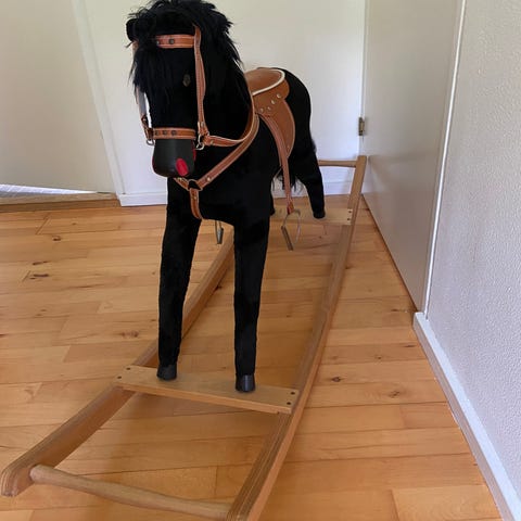 Gyngehest, kan bruges fra 1 til 4 år. Hynde i kunstig pels medfølger. Ingen brugsspor. Længde 66cm, højde 50 cm, bredde 27 cm