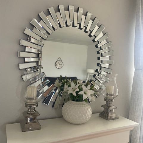 Smukt stort håndlavet spejl købt hos Living Goodies til 6.240 kr. meget fin stand. Har enkelte små mærker i rammen i bunden. Har haft funktion af at give hygge og god rumvirkning i hall i villa.