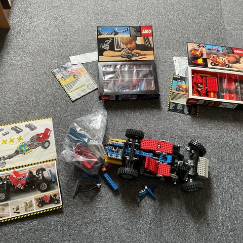 LEGO Technic byggesæt med entreprenørmaskiner og gaffeltruck. Sættene består af teknikelementer i primært gule, blå, røde og sorte farver. Der medfølger originale æsker og trykte byggevejledninger, som viser forskellige modeller, der kan samles af klodserne. Egnet til børn og andre, der ønsker at bygge mekaniske køretøjer og maskiner med LEGO Technic dele.