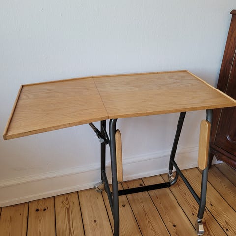 Gammelt skrivemaskinebord med ekstra klap, der kan slås op. Mangler en liste på den ene side, men er ellers fuldt funktionsdygtigt. Se målene på billeder.