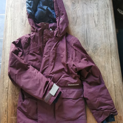 Lækker og varm Didirksons pige vinterjakke med vindfang i ærmer der også kan forlænges. Kun brugt 1 år. Mangler desværre hætten.