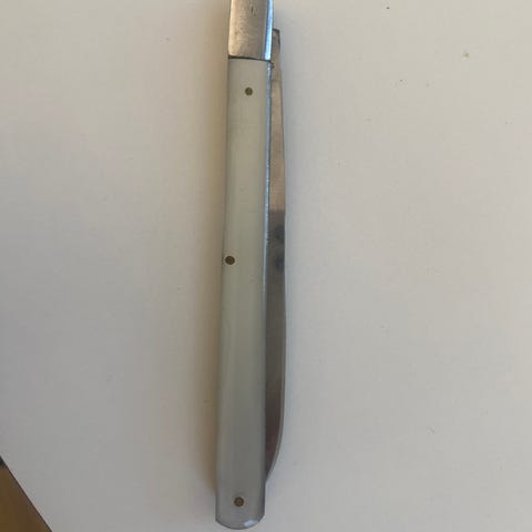 Bladets længde er 7 cm selve skæftet er 9 cm, foldekniven er brugt og trænger til at blive poleret op