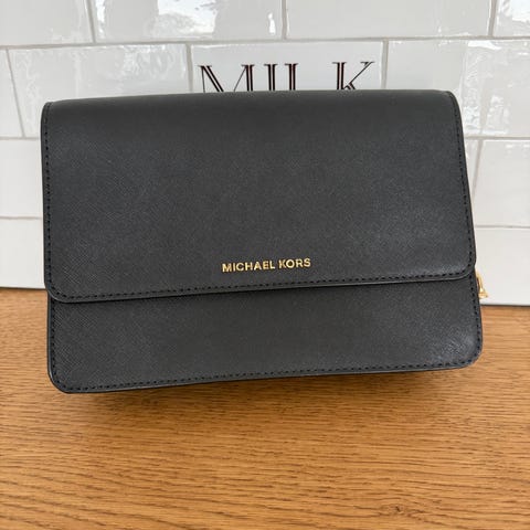 Michael Kors skuldertaske i sort med logo-mønster. Tasken har kæderem med læderstykke ved skulderen og metaløjer ved remfæstet. Foran ses Michael Kors-logo samt rundt vedhæng med MK-logo. Egnet som hverdagstaske eller arbejdstaske med plads til personlige ejendele.