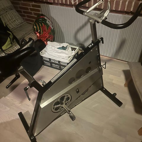 Spinningcykel i sort farve. Cyklen har justerbart sæde og styr, pedaler med stropper samt svinghjul foran. Egnet til indendørs konditionstræning og intervaltræning i hjemmet. Cyklen kan tilpasses forskellige brugere via højdejustering af sæde og styr.