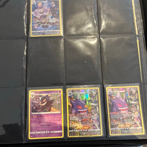 Pokémon samlekort mappe med blandede kort. Mappen indeholder forskellige Pokémon-kort i plastlommer, herunder flere typer elementer og motiver. Kortene fremstår som en blandet samling på tværs af forskellige serier og udgivelser. Velegnet til samlere eller som udvidelse af eksisterende Pokémon-kortsamling.