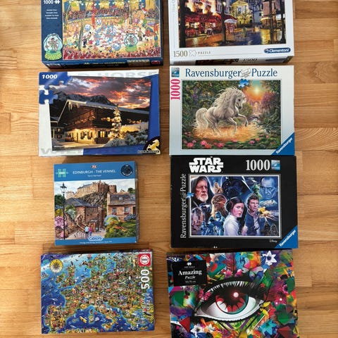 Wasgij kr 110 (2x1000 brikker), , Van Haasteren kr 90. Wasgij kr 100.