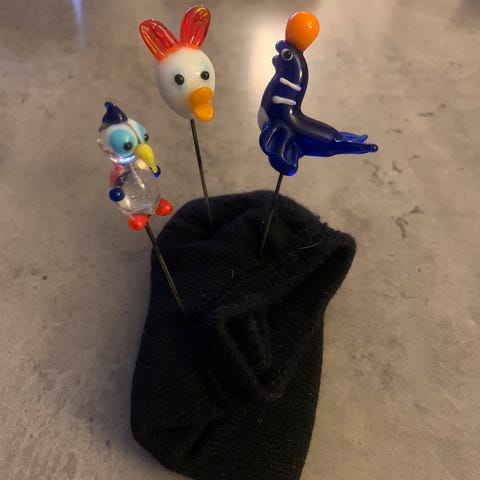 Dekorative nåle med små figurer i forskellige motiver, blandt andet ænder, dyr og en garderfigur. Nålene har metalstift og figurer i farvet materiale, velegnet til dekoration, håndarbejde eller samling. Sælges samlet som vist på billederne.