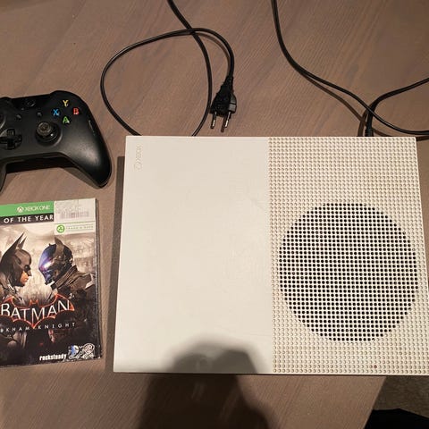 Microsoft Xbox One S konsol i hvid, den har nogle forbrugsridser men intet funktionsmæssigt afgørende. Konsollen er uden DISC drev, alle spil skal købes digitalt og downloades igennem Microsoft store eller andre løsninger som gavekort kodeindløsninger.