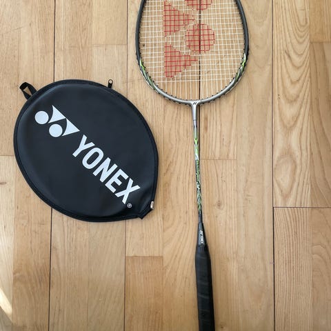 Yonex Nano Speed badmintonketcher med tilhørende cover. Ketcheren har oval hovedform med gul opstrengning og Yonex-logo i strengene. Skaftet er slankt og grebet er sort med Yonex-tryk. Coveret er sort med lynlås og skulderrem, som beskytter ketcheren under transport og opbevaring. Velegnet til badmintonspil i hal, både til træning og kamp.