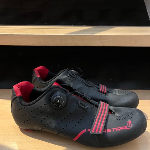 Astral cykelsko og spinningsko i størrelse 47. Skoene er sorte med justerbare velcrostropper og spænde øverst. Sålen har påmonterede klamper. Til landevej eller spinning afhængigt af klampevalg.