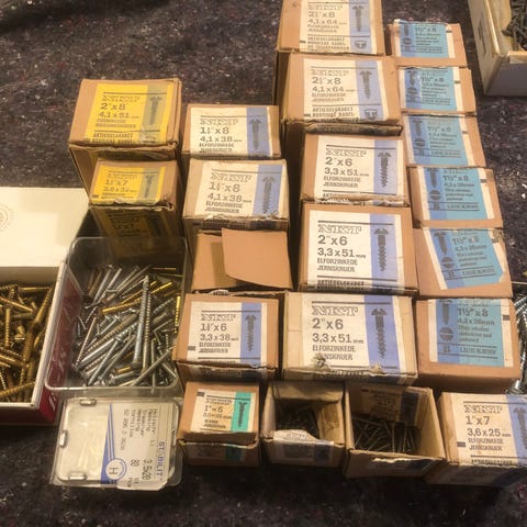 Blandet kasse med skruer, rawlplugs og småbeslag