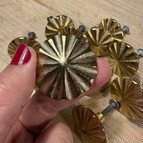 25 stk. Vintage møbelgreb med tilhørende messingskruerskruer. Messinglignende overflade. Små greb 57x32 mm med tilhørende små skruer. Skal afhentes I Risskov