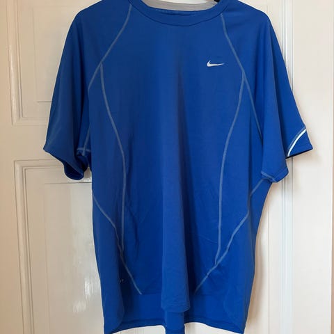 Nike langærmet løbetrøje i størrelse S. Trøjen er blå og har rund hals samt Nike-logo på brystet. Egnet til løb og anden træning, hvor der ønskes en let og langærmet overdel.