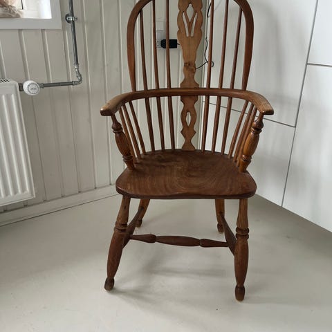 Stolen har drejede ben og armlæn samt tremmeryg med dekorativ udskæring i øverste del af ryggen. Overfladen fremstår lakeret i en varm træfarve.