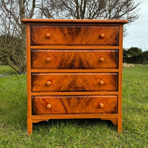 Fin lille kommode i fyrretræ; malet som en ædlere træsort. Jeg mener at den er fra Kerteminde-egnen.. skufferne går desværre ikke så godt, men de kan nok smøres. Der er brugsspor på bordpladen (se sidste billede), men ellers er den velholdt.