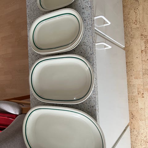 Tallerkener i forskellige størrelser. Der er enkelte skår og de er godt brugt, deraf den billige pris.