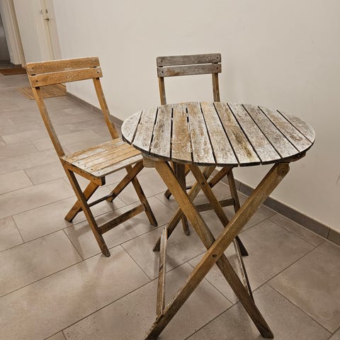 Café sæt bestående af et firkantet klapbord og to klapstole i træ. Sættet er malet lyseblåt og har lameller i både bordplade og sæder/ryglæn. Velegnet som lille cafésæt til altan, terrasse eller have. Overfladen fremstår med synlig slitage i malingen, som giver et patineret udtryk.