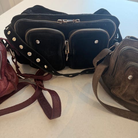 Nunoo skuldertaske i ruskind til kvinde. Tasken er udført i sort ruskind med flere lynlåslommer på fronten, som giver god mulighed for opdeling af mindre ejendele. Justerbar skulderrem med metaløjer. Velegnet som hverdagstaske til nøgler, pung, telefon og andre personlige ting.