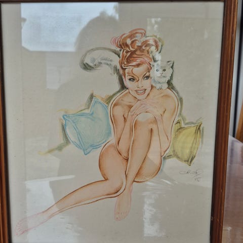 Merete Riebel tegning med farverige figurer, indrammet i lys passepartout og metalramme. Motivet består af flere stiliserede ansigter, figurer og katte i stærke farver på lys baggrund. Billedet er signeret nederst i højre hjørne. Bagsiden viser ophængswire monteret på rammen. Velegnet som vægdekoration i stue, kontor eller andre opholdsrum.