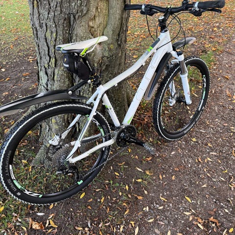 Cube mountainbike til kvinder med stelstørrelse M og 29" hjul. Cyklen er udstyret med forgaffel med affjedring, flade styr og skivebremser. Stellet har en geometri tilpasset kvinder, og cyklen egner sig til både skovstier og kørsel på faste underlag. Monteret med skærme for og bag samt standard pedaler.