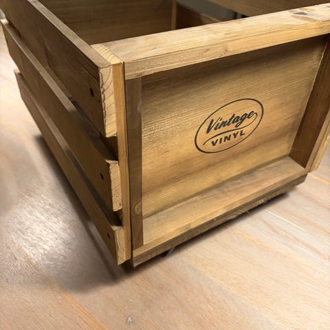 Hjemmebygget solid pladekasse til opbevaring af vinyler med hjul. Fungerer perfekt