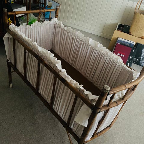 IKEA sammenklappelig tremmeseng til baby/barn. Sengen har blåt tekstil med stjerne- og månemønster samt net-sider på langsiderne, som giver udsyn og ventilation. Stellet er i metal, og bunden er i plade, der kan tages ud ved sammenklapning. Sengen kan foldes sammen for nem opbevaring eller transport. Velegnet som ekstra seng eller rejseseng til mindre børn.