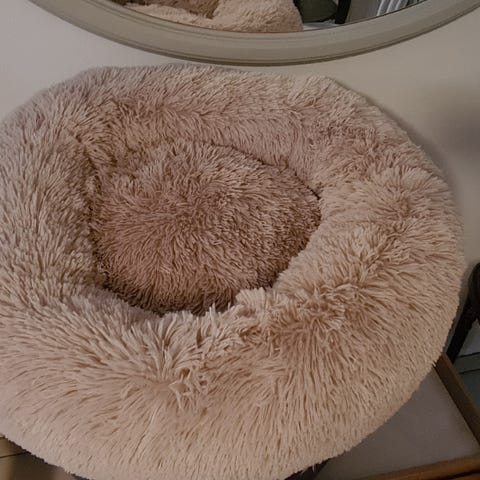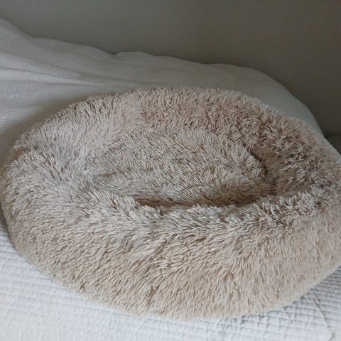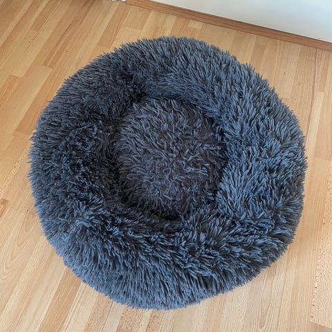Rund hundeseng med blød plys i beige.