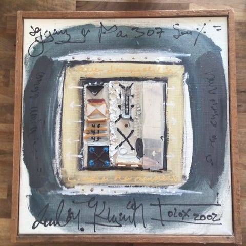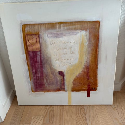 Abstrakt maleri i kvadratisk format med flerfarvet motiv. Billedet har en struktureret overflade med blandt andet grønne, røde, lilla og mørke nuancer på lys baggrund. Maleriet er indrammet i en enkel ramme og egner sig som vægdekoration i eksempelvis stue, kontor eller gang. Velegnet til ophængning alene eller som del af en billedvæg.
