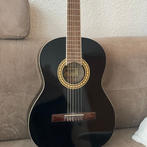Den har en revne i kassen og skæv hals som måske kan justeres. Strenge ligger for tæt på halsen lige nu så den klirrer .