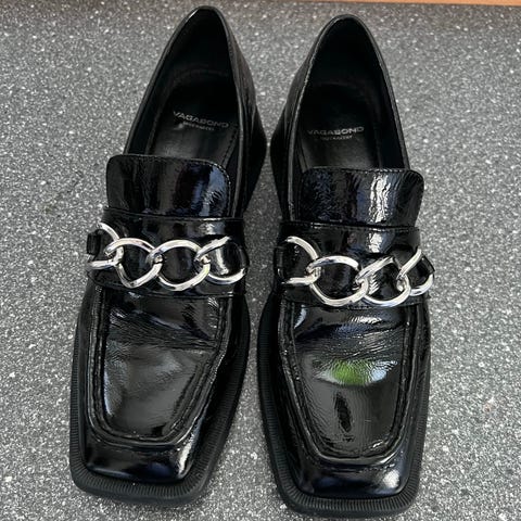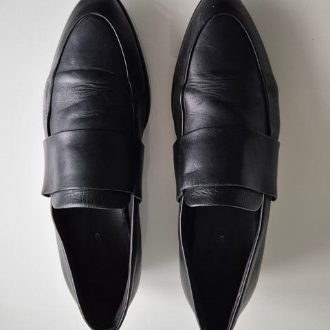 Vagabond loafers sko i størrelse 36. Skoene er i sort læder med dekorative frynser og bred rem over forfoden. De har rund snude og kraftig gummisål med mønster under for bedre greb. Klassisk loafer-model, der kan bruges til både hverdag og mere formelle anledninger.