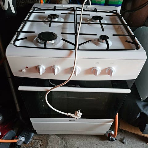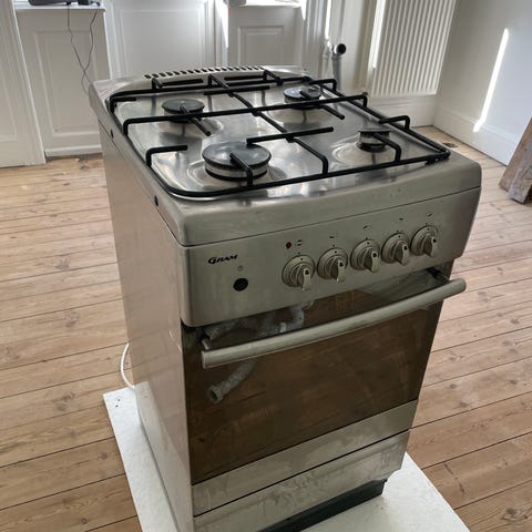 Gram gaskomfur med fire gasblus og ovn. Komfuret har traditionel gasbrænderopsætning med støbejernsrist over blusene og integreret ovn med glaslåge. Velegnet til madlavning og bagning i køkkenet, hvor der er gasinstallation til rådighed.