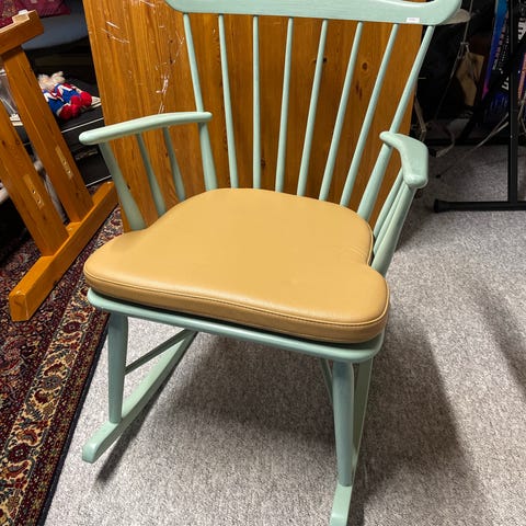 Fastrup gyngestol i flot patineret stand efter alm brug.. hynden er betrukket med læder og fremstår i flot stand .. god solid gyngestol med et flot klassisk design og skøn sidde komfort. Pris 1600,-