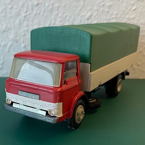 Vitrine bil som ikke har været leget med. Bilen har ingen skrammer eller afslag. Bilens forrude er dog bleget af sollys og så mangler rattet desværre. Ellers er bilen intakt og hel. Ladets sider og bagsmæk kan vippes ned og rækværk kan afmonteres. Lad og påmonterede dele i plast ellers er bilen i metal. Forhjul har drejefunktion og førerhus kan tippes for adgang til motorområde. Bilen er fra Tekno Holland og er produceret i midt til slut 70erne. Bilen er ca. 17,5 cm. lang og ca, 5,5 cm. høj. Super flot bil for samleren. Desværre forefindes den originale æske ikke. Kan afhentes, men sender gerne sporbar til pakkeshop for 30,- Bruger ikke fix færdig.