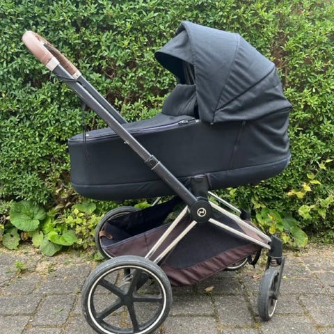 Cybex barnevogn med liggedel i sort. Vognen har stor liggedel med hvid, polstret inderside og kaleche. Den er udstyret med fire hjul, drejelige forhjul og justerbart skubbehåndtag. Understellet har kurv til opbevaring under vognen. OBS: der er et lille hul i kurven men har ingen betydning for vognen!