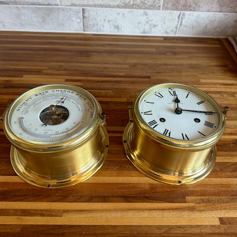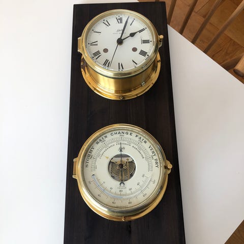 Schatz Royal Mariner skibsur og termometer/barometer monteret side om side på rektangulær træplade. Begge instrumenter er udført i poleret messing med hvid urskive/barometerskive.
