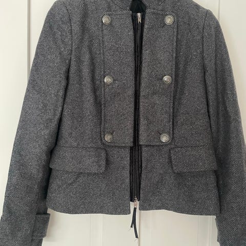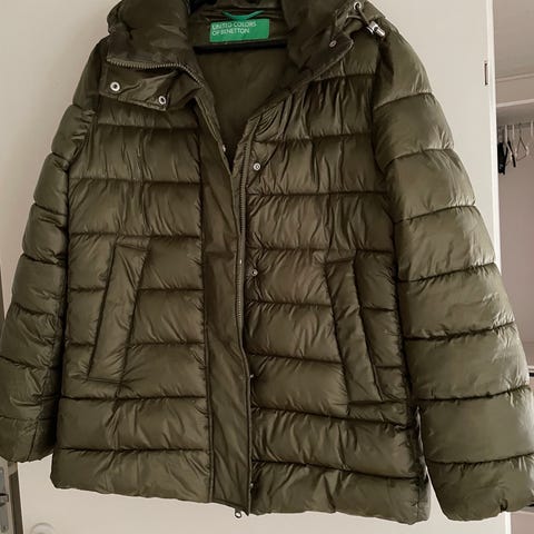 Benetton jakke i sort farve, størrelse 42. Jakken er fremstillet i 40 % uld og 22 % polyester og 18 % bomuld, 17 % nylon