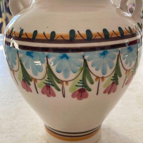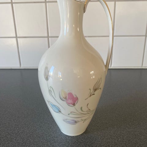 Heinrich & Co porcelænsvaser i hvid med håndmalet blomster- og grenmotiver rundt om korpus. Vasen har rund, svungen form med bred hals og dekoration langs kanten. Bunden er stemplet med Heinrich & Co mærke. Velegnet som dekorativ vase til blomster eller som pyntegenstand i hjemmet.