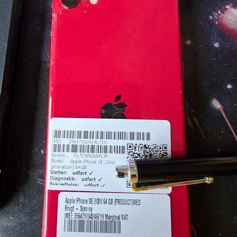 Apple iPhone SE (2-3 gen) smartphone med 64 GB intern hukommelse. Modellen er i rød farve med glasbagside og Touch ID-knap på forsiden.