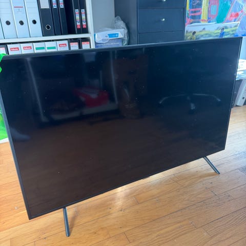 50 tommers Samsung fladskærms-tv i sort. Tv’et er vægmonteret på billederne men benene følger også med.