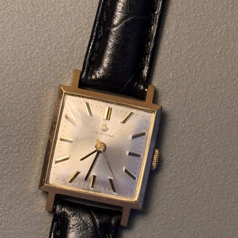 Certina dameur analogt armbåndsur med guldfarvet urkasse og lys guldfarvet skive. Uret har markeringer for timer og datovisning. Remmen er brun og fremstår som en klassisk læder- eller læderlook-rem med traditionel spænde. Mekanismen er analog med optræk via krone i siden. Bagsiden er markeret med serienummer og angivelse af vandbeskyttelse. Velegnet som klassisk hverdags- eller dress-ur til kvinder. Flot vintage dameur, jeg ved ikke hvad urkassen er lavet af, jeg kan ikke åbne det, det kommer med original tilhørende boks , ingen garanti gives for uret i fremtiden, men det går upåklageligt.