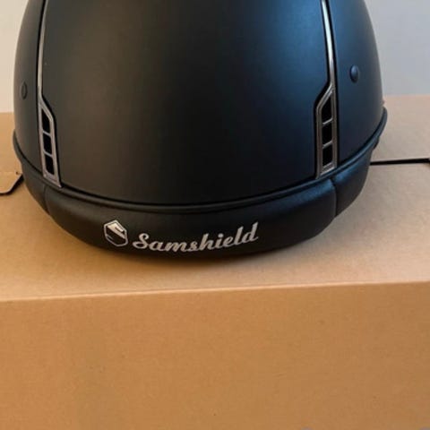 Samshield ridehjelm i størrelse M med liner 58 cm (M). Hjelmen er navy med guldfarvede detaljer på front, sider og ventilationsåbninger. Ydersiden har en ruskinds-/velourlignende overflade, mens kanten bagtil er i glat materiale med Samshield-logo. Indersiden har polstret, udtagelig og ventileret liner med mesh for øget komfort. Velegnet som ridehjelm til både daglig træning og stævnebrug.taske med følger og er 3 år gammel der er ny liner indsat og ny prisen 6000kr
