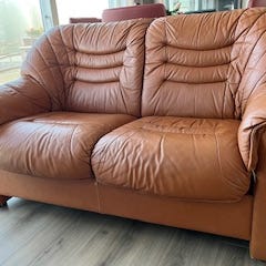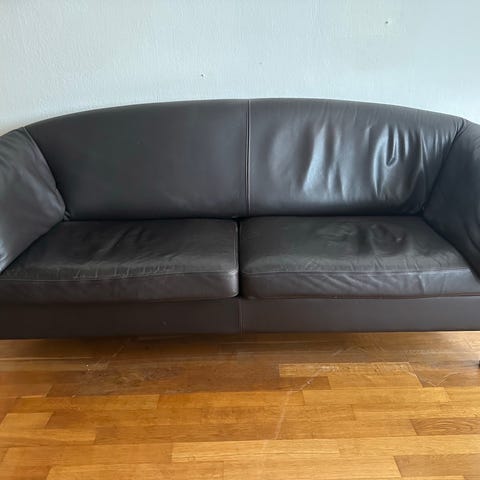 Gammel sofa købt for 11 år siden ved Langelinie i København. Oprindeligt var sofaen rød, og sælger havde malet den med sort læderfarve. Ukendt producent og design.