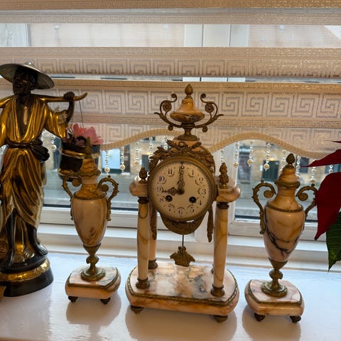 Fransk kaminur, urskive med hvid emalje og romertal.