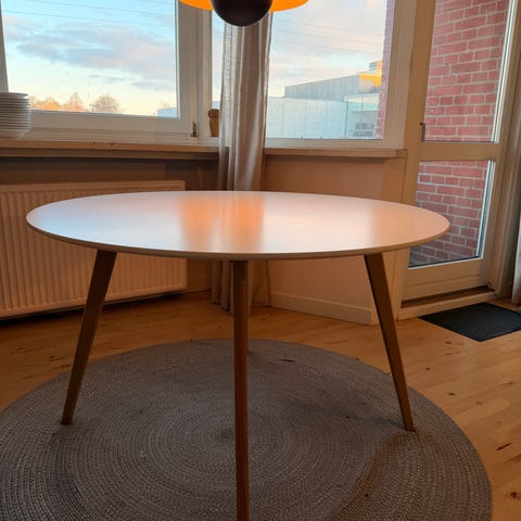 Mindre end et år gammelt rundt hvidt spisebord fra Jysk. Måler Ø 100, og højde 75 cm.