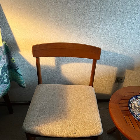 Spisestuestol i hvidmalet træ med krydset rygdesign. Stolen har polstret sæde med mønstret betræk i lyse nuancer. Egnet til brug ved spisebord eller som ekstra stol i køkken eller stue. Stolene kunne godt bruge nyt stof på sæderne