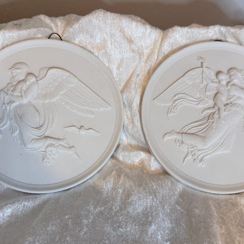 Dette er et sæt af fire Royal Copenhagen bisquit-relieffer med motiver baseret på Bertel Thorvaldsens berømte værker.