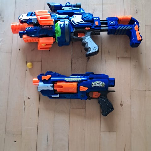 5 Geværer, magasiner, skumgummi patroner, skjolde og briller. Firma Nerf.